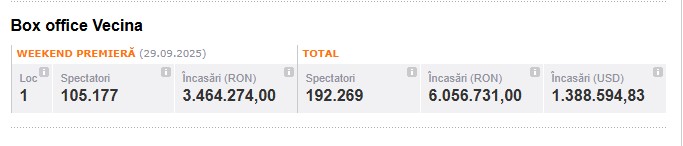Și succesul filmului Vecina se vede în cifre. După două săptămâni de stat în cinematografe, filmul a adunat peste 1.3 milioane de dolari și 192.000 de spectatori.